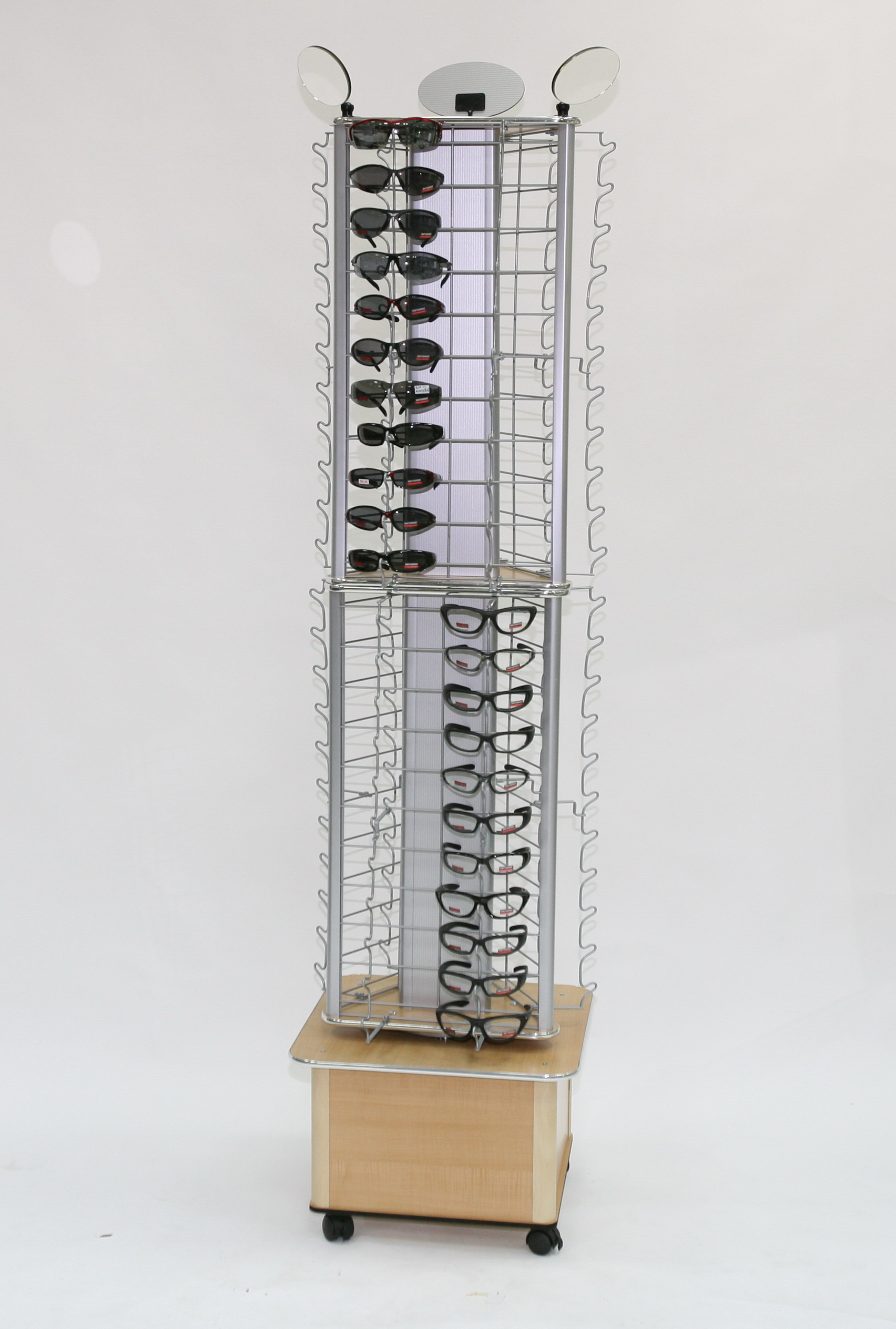 SUNGLASS RACK; SILVER METAL/WIRE/PVC; ROTATES FREELY; 2 SIDE MIRRORS; TOP SIGNHOLDER; HOLDS 72 PAIRS
