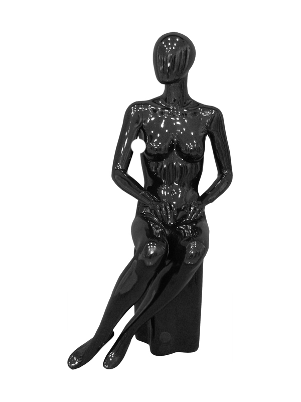 FEMALE MANNEQUIN BLACK WITH HEAD; SITTING LEGS TO THE SIDE; HEIGHT: 5’9″; SHOULDER: 16″; CHEST: 33″; WAIST: 25 1/4″; HIP: 36 1/4″; SITTING STOOL INCLUDED