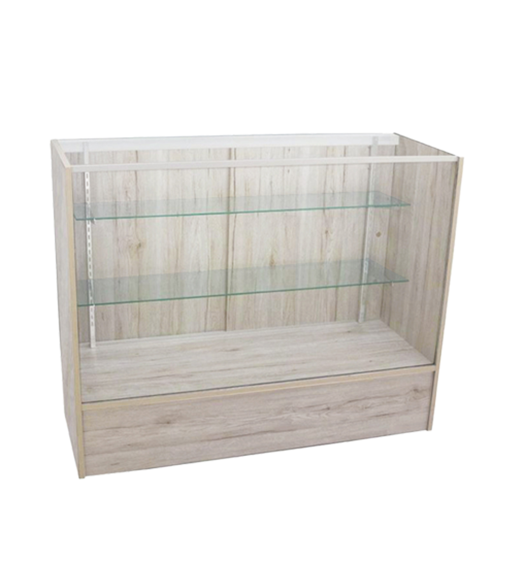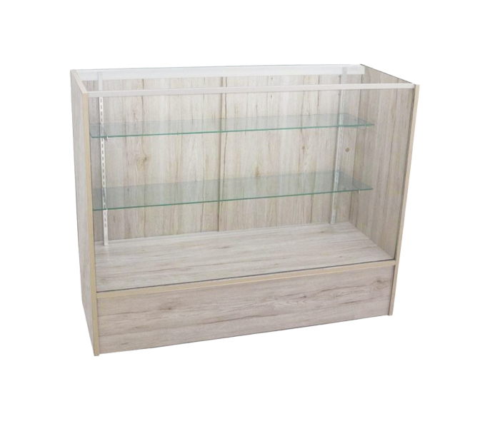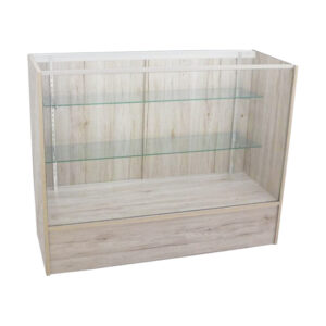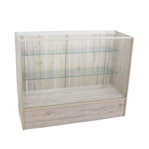4′ Full Vision Showcase; 48″(L) x 18″(W) x 38″(H); 28″ Front Viewing Area; 10″(H); INCLUDES: 2 ADJUSTABLE GLASS SHELVES, LOCK INCLUDED