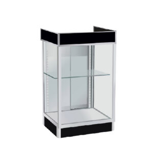 Silver Extra Vision Register Stand; 24″L x 20″D x 38″H; 1 Adjustabel Shelf; Sliding Wood Panel Door Lock and Keys; Tempered Glass; 4″ Kickbase