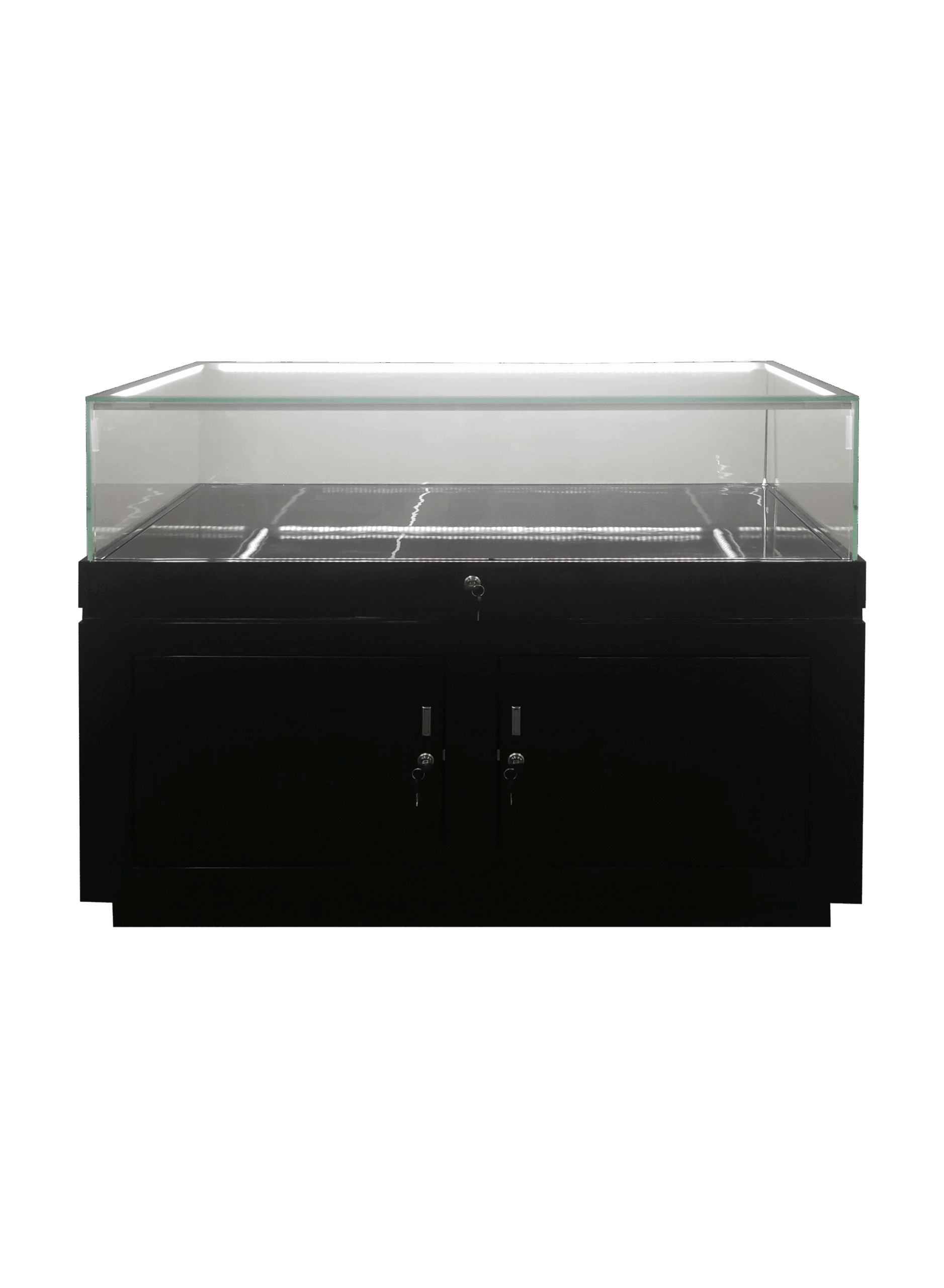 JEWELERY/MUSEUM DISPLAY CASE; 48″L x 23 1/2″D x 37 1/2″H; TEMPERED GLASS TO GLASS TOP AND SIDES- 3/8″T; LED LIGHT 75W; GLASS HEIGHT: 10 1/4″; BASE HEIGHT: 26 1/4″; STORAGE BOTTOM W/LOCK- GLOSSY BLACK FINISH