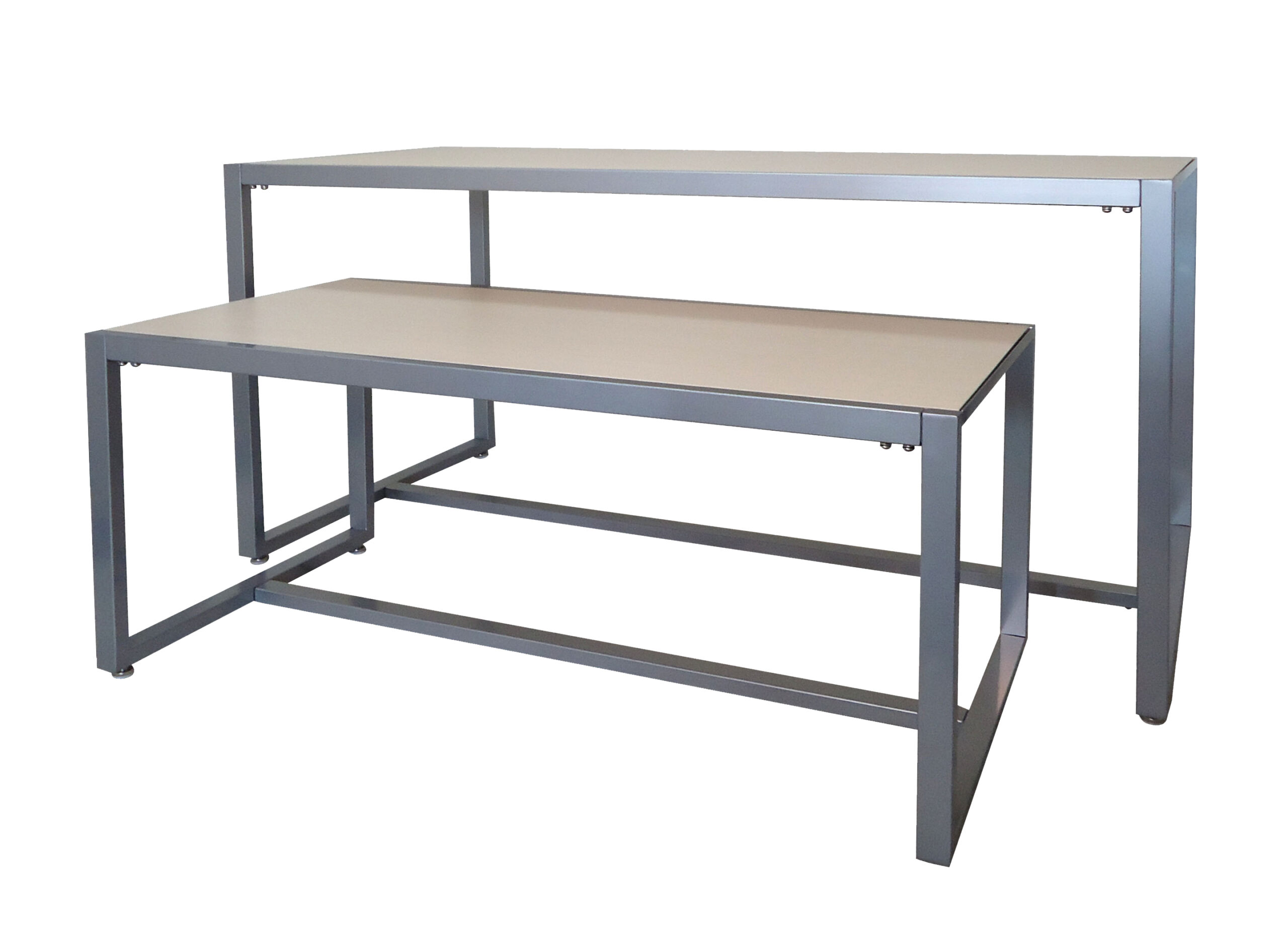 • 48"L x 30"W x 36"H• WHITE MELAMINE SHELVING• SHELF SIZE: 45 1/2"L x 27 1/2"W x 3/4"T• CHROME CORNER LEG ACCENTS 1 1/4"T