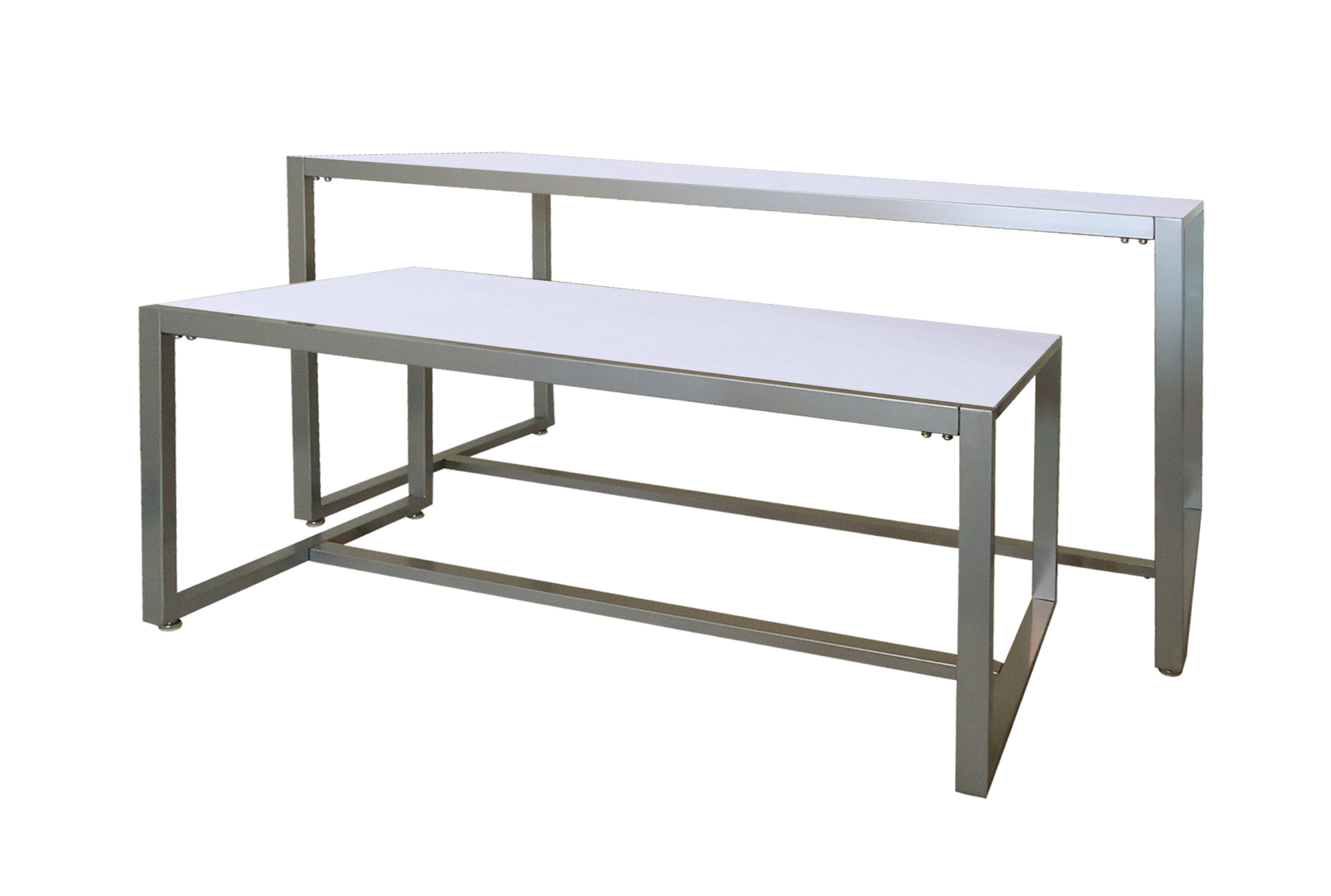 • FRAME: 48"L x 30"W x 31"H• WHITE MELAMINE TOP• TOP SIZE: 46"L x 36"W x 3/4"T• CHROME CORNER LEG ACCENTS 1 1/4"T