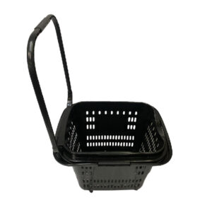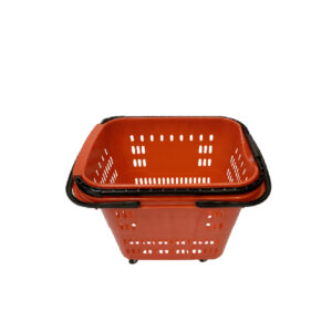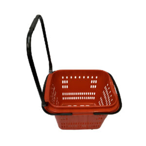 4 WHEELS ROLLING SHOPPING BASKET” 22″ x 16 1/2″ x 17 1/2″; CONVENIENT PULL HANDLE & EASY CARRY HANDLE; 2″ CASTERS; RED