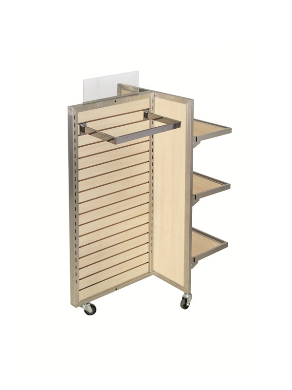 • GONDOLA SLATWALL MERCHANDISER• 3 PANELS: 25"(L) x 25"(W) x 54"(H)• SATIN NICKEL FRAME STANDARD• W/ALUMINUM INSERTS• 3" HEAVY DUTY CASTERS